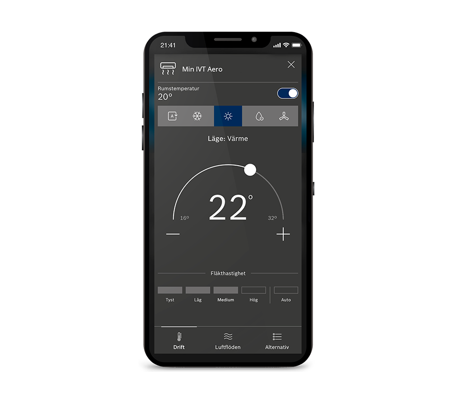 Reglera temperatur och alla värmepumpens funktioner - var du än befinner dig. Med appen IVT Anywhere II har du alla funktioner till värmepumpen integrerade i din telefon. Denna app-styrning ingår i alla nya värmepumpar från Aero-serien.